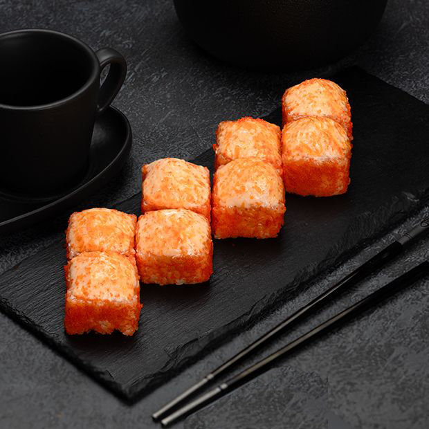 Рис,нори,сыр творожный,краб,сырный соус, икра масаго