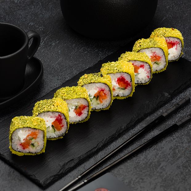Рис,нори,сыр творожный,лосось,огурец,икра масаго